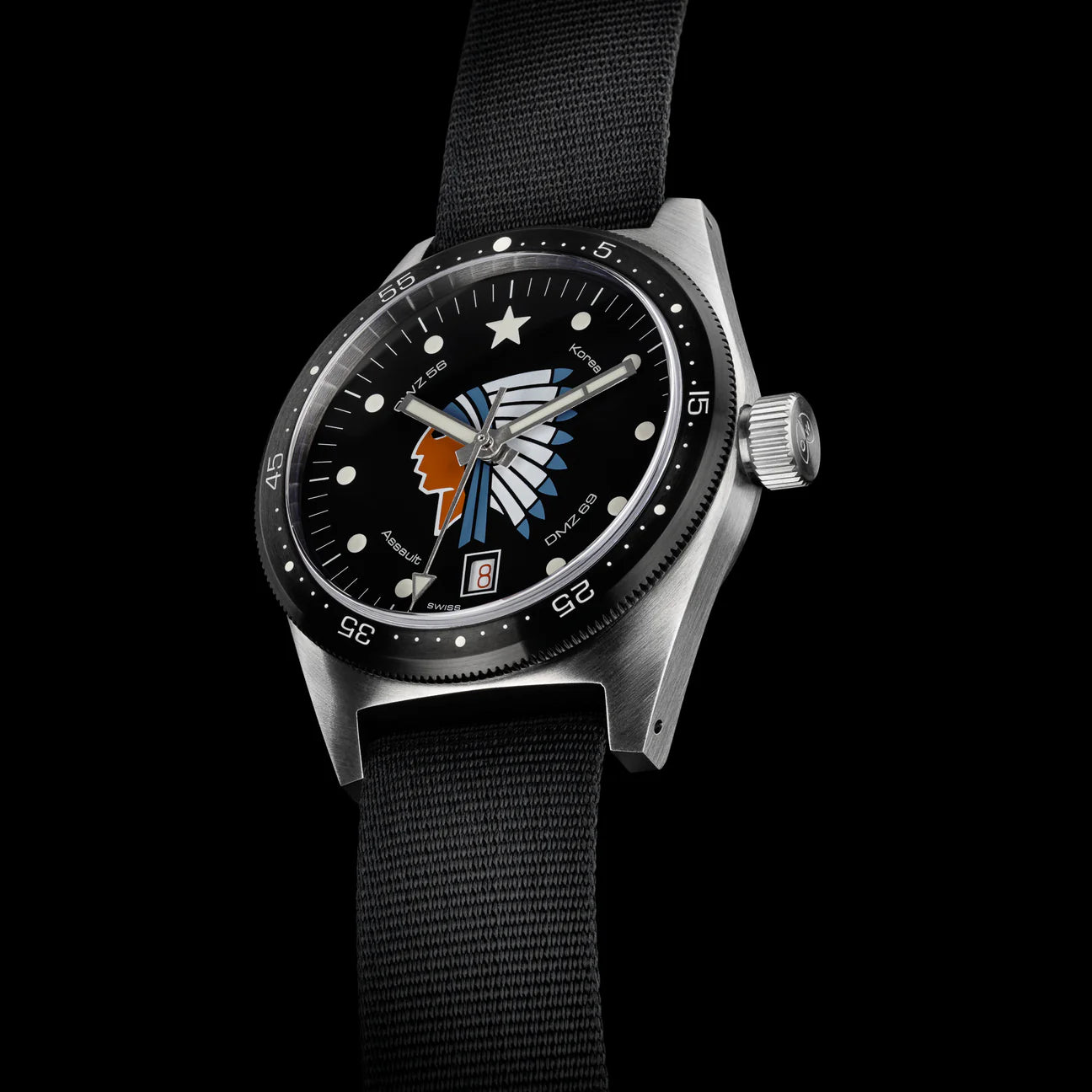 After more than fifty years in the Ollech & Wajs archives, a nearly forgotten watch, originally designed for US Army infantrymen during the Cold War, has been revived. The OW MK-102 is inspired by the 1969 K-101, a custom watch created for troops of the US Army's 2nd Infantry Division, nicknamed "Indianhead," who protected the Korean Demilitarized Zone from 1965 onward. Their mission: to defend the peninsula against incursions from the North. The MK-102 features the same vintage Indian head insignia as the original model, a symbol of strength, courage, and tenacity, instilling a warrior spirit in those who served in this strategic theater of operations.