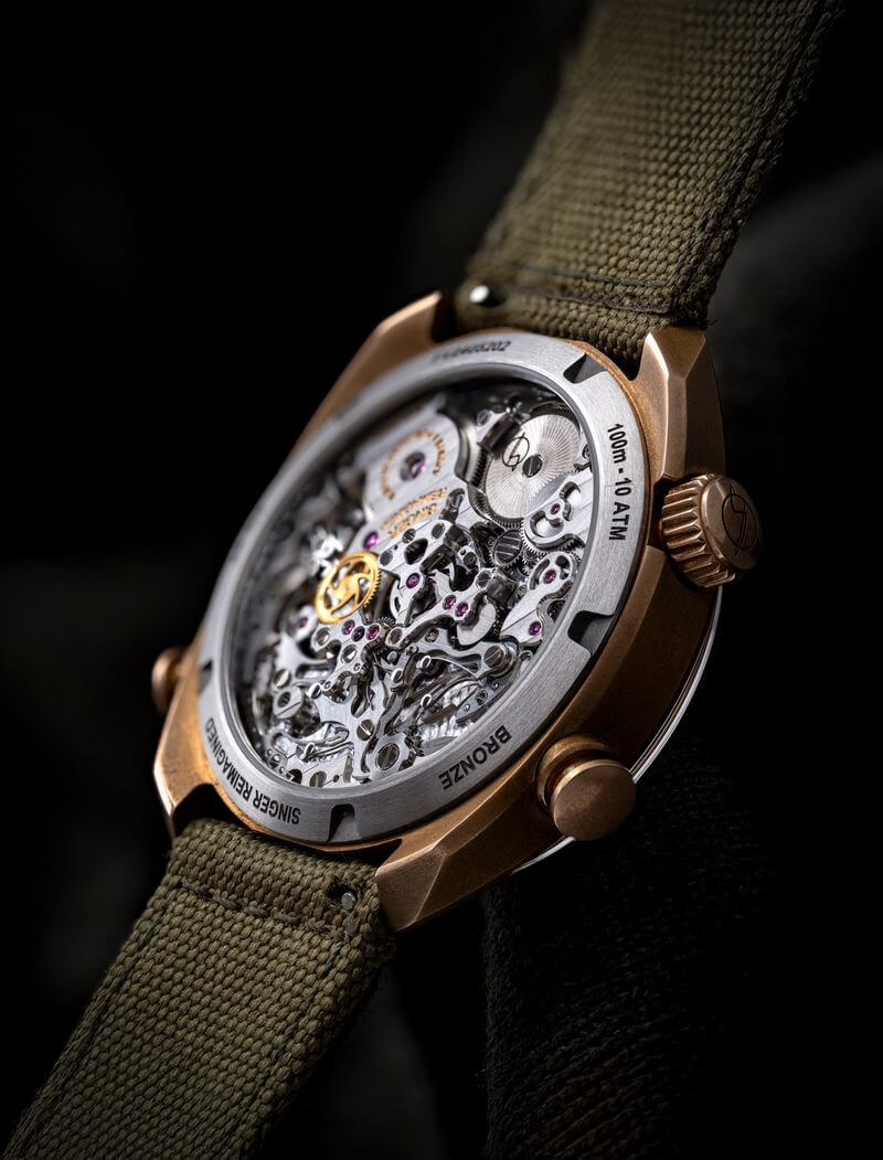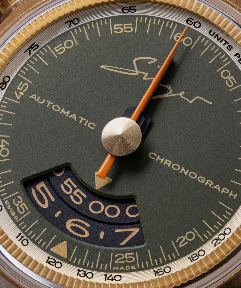 Le cadran vert mat profond dégage une chaleur tactile, rehaussée d’accents crème et de détails dorés. Au centre trône la signature de Singer : un chronographe central intégrant secondes, minutes sautantes et heures sautantes, le tout fonctionnant sur une échelle base 60.