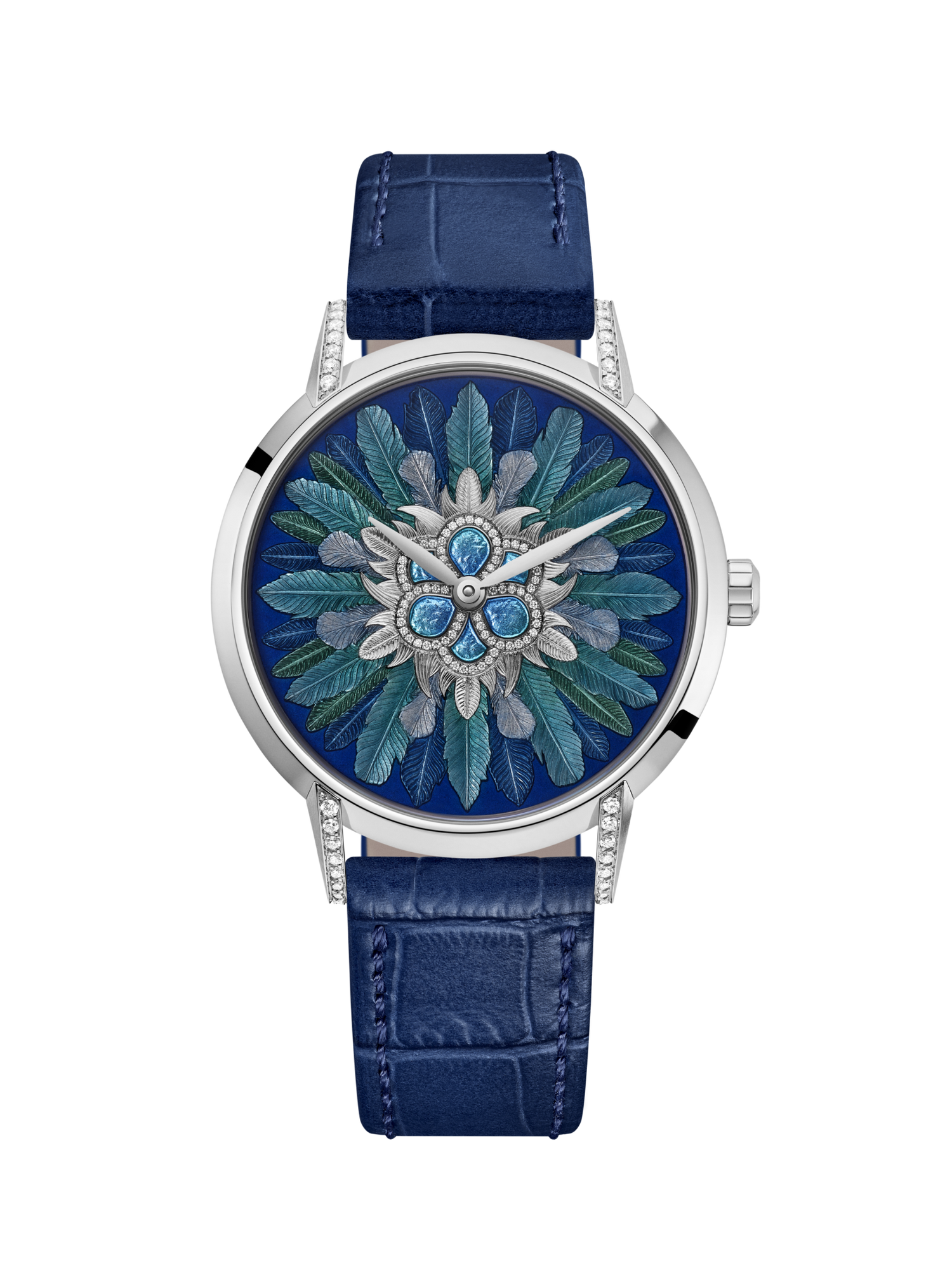 Déploiement de plumes gravées sur plusieurs niveaux puis recouvertes d’émail, une fleur de paillon d’argent émaillé cerclée de diamants. Multi couches, cuissons, détails, micro-coups de burin se multiplient dans l’ouverture d’un motif de rosace délicat.