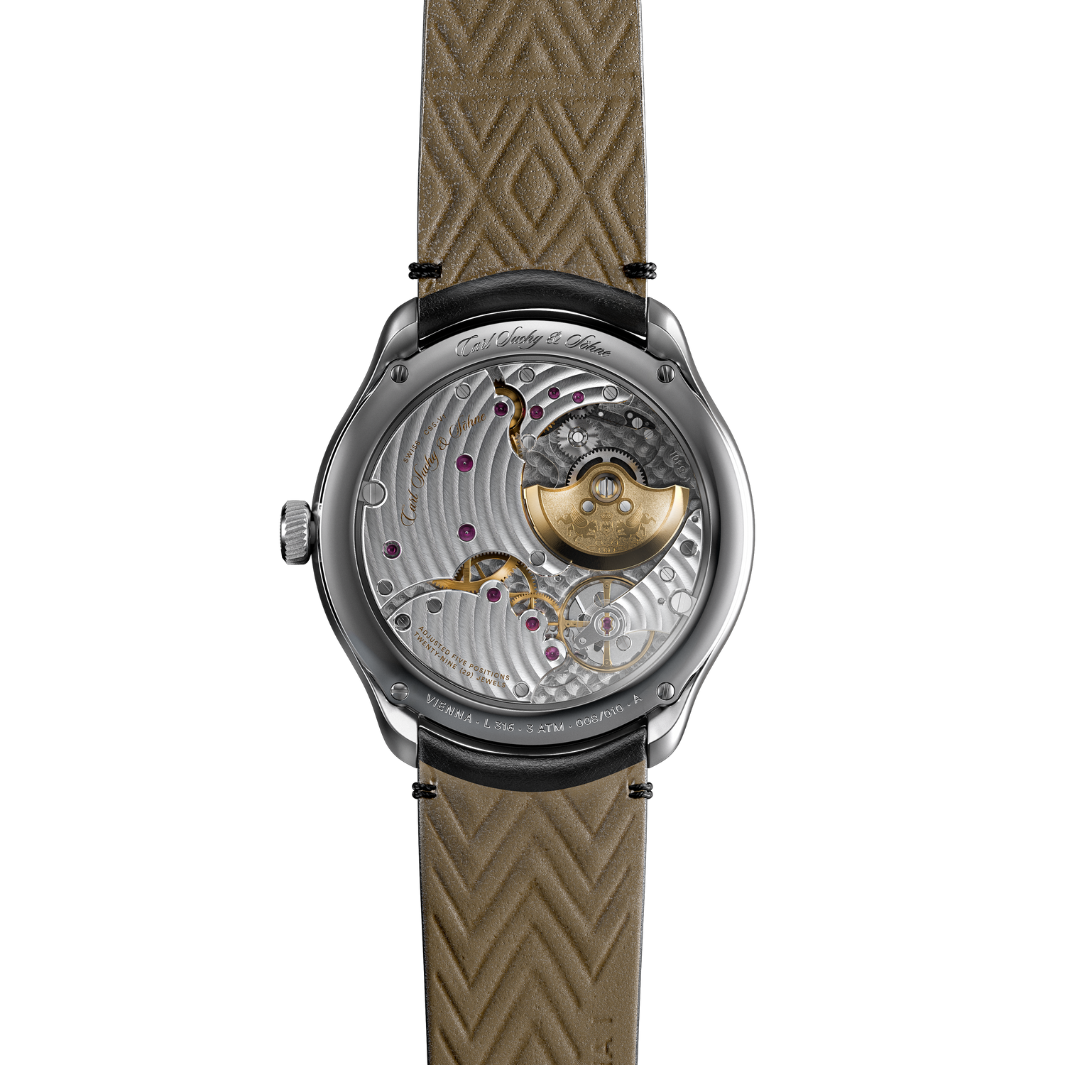Au dos du boîtier, un détail caché se révèle : le micro-rotor doré finement gravé de doubles griffons — une touche de splendeur impériale et un symbole de royauté, visible uniquement par son propriétaire. Le bracelet en cuir fin rend un autre hommage discret à Vienne : sa face intérieure est ornée d’un motif micro-gravé inspiré des célèbres tuiles de la cathédrale Saint-Étienne